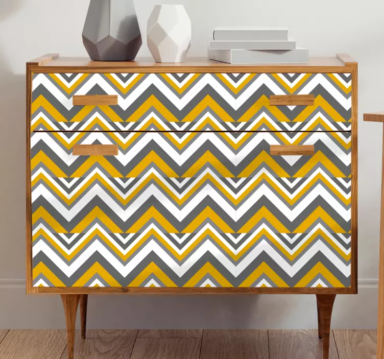 Esittelyssä Huonekalutarrachevronkuvio, joka tuo kotiisi modernia pohjoismaista tyyliä! Tämä graafinen suunnittelu yhdistää geometriset muodot, kuten siksak- ja kolmiot, luoden ainutlaatuisen ja viehättävän ilmeen. Värimaailma koostuu keltuaisista ja harmaista sävyistä, jotka täydentävät sisustustasi loistavasti. Huonekalutarra on täydellinen valinta, kun haluat lisätä persoonallisuutta ja tyyliä huoneeseesi!