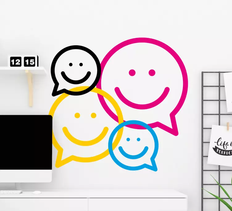 Viite: A49042Leikkisä järjestely hymyileviä kasvoja eri kokoisina ja väreinä edustaa iloa ja viestintää. Nämä iloiset ikonit, tyyliteltyinä puhekuplilla, herättävät tunteita ja luovat elävän tunnelman, täydellinen tiloihin, jotka pyrkivät inspiroimaan positiivisuutta.