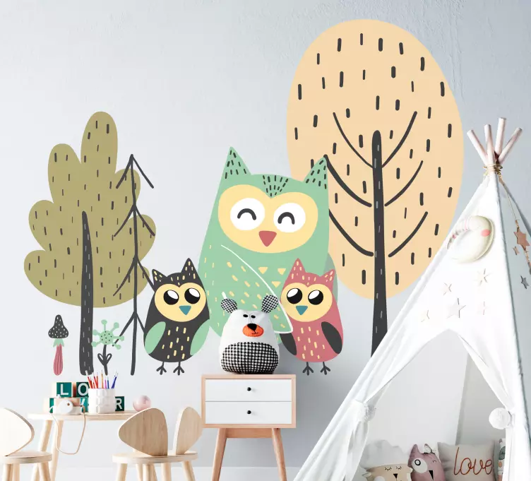 Iloinen pöllöperhe seinätarra lastenhuone