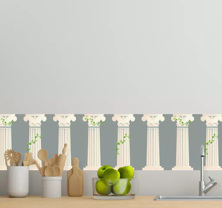 Klassinen pylvään koristereunus tarra on täydellinen lisä keittiön suunnitteluun ja sisustustyyliin! Sen kreikkalainen design, joka sisältää sarakkeita ja viiniköynnöksiä, tuo tyylikästä eleganssia mihin tahansa tilaan. Tämä graafinen kauneus ei vain ole visuaalisesti miellyttävä, vaan se myös luo ainutlaatuisen tunnelman, joka herättää huomiota!