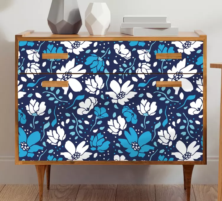 Tervetuloa kukkien maailmaan! Kukallinenkuvioinenhuonekalutarra on upea lisäys sisustukseesi, joka tuo mukanaan raikkaan luonnon tunnelman. Tämä graafinen suunnittelu on täynnä kauniita koiranputkia, päivänkakkaroita ja värikkäitä kukkia, jotka luovat harmonisen ja elävän ilmeen. Sininen ja valkoinen väri yhdistyvät täydellisesti, ja kuvio tuo mieleen kesäiset niityt, joissa luonto kukoistaa!