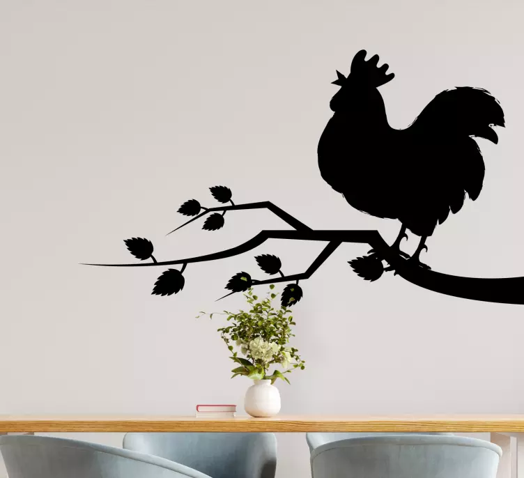 Viite: A49034Viehättävä kukon siluetti oksalla, yhdistäen luonnon ja maatalouden elementtejä. Oksan koristeena olevat lehdet tuovat orgaanista tunnelmaa, joka lisää suunnittelun maalaismaista viehätystä, täydellinen tuomaan maalaistunnelmaa mihin tahansa tilaan.