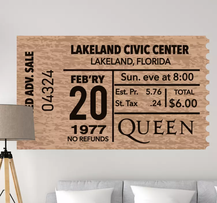 This Queen concert ticket rock vinyl sticker can be decorated in any space to represent yourself as a fan and enthusiast of the Queen band. The kuningatar concert ticket sticker is perfect for all rock music lovers and includes all the information about the concert that took place in Lakeland, Florida in 1977. Its application is easy, you can install it on the wall, door, furniture, laptop, and any other flat surface.