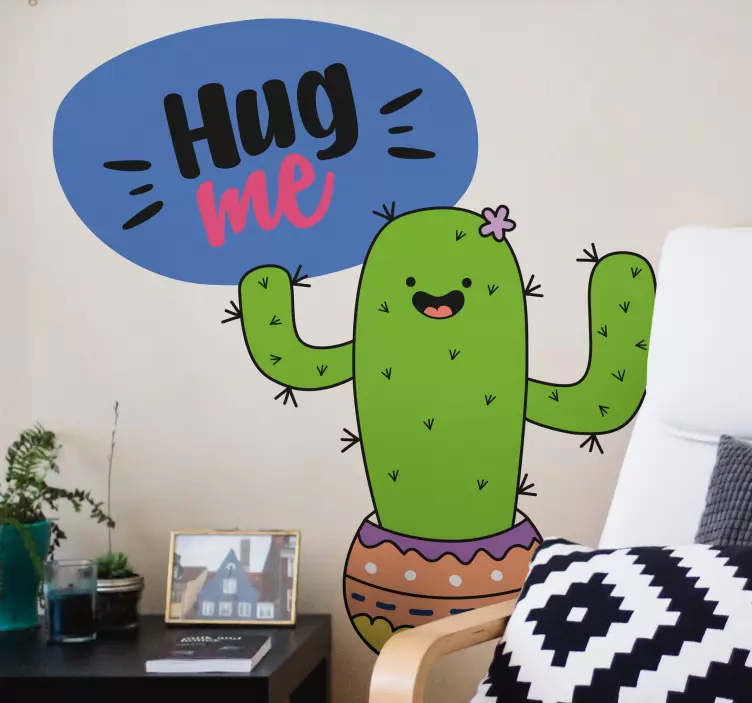Viite: A46921Iloinen kaktushahmo, jossa on ystävällinen hymy, koristeltuna eloisalla kukalla ja värikkäällä ruukulla. Siinä on leikkisä puhekupla, jossa on teksti "encouraging hugs", mikä lisää kevyttä tunnelmaa koko suunnitteluun.