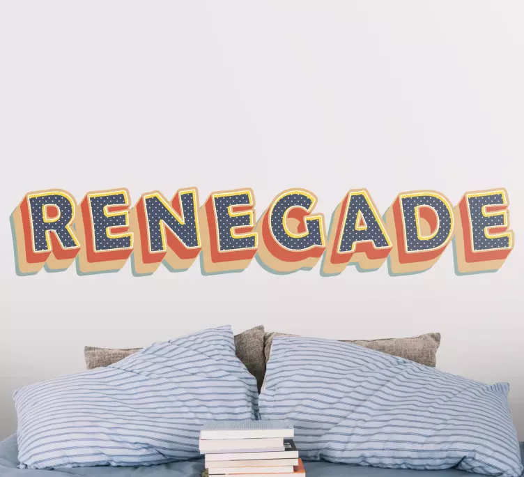 Viite: A48092Sanan 'Renegade' kiehtova typografia esittelee vaikuttavan värien ja muotojen yhdistelmän, joka tekee rohkean lausunnon. Tämä silmiinpistävä muotoilu tuo persoonallisuutta ja tyyliä mihin tahansa tilaan, kutsuen esiin yksilöllisyyden ja luovuuden.