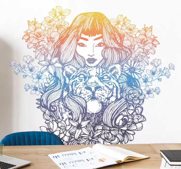 Esittelyssä Nainentiikerinkanssasisustustarra, joka on visuaalisesti kiehtova yhdistelmä kelttiläistä taidetta ja rohkeita värejä! Suunnittelussa yhdistyvät nainen, tiikeri, piirustus ja kukkat, luoden upean viivapiirros -tyylisen ilmeen. Tämä taideteos herättää eloon tilasi ja tuo siihen ripauksen luontoa ja voimaa!