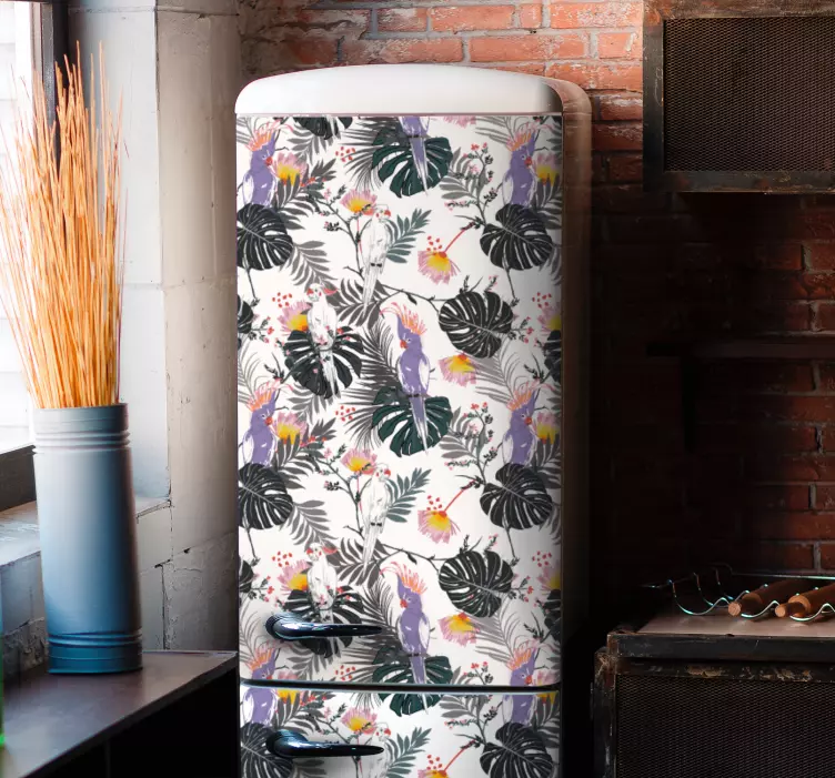 Viite: A34782Punaiset ja violetit papukaijat trooppisilla lehdillä Jääkaappitarra!