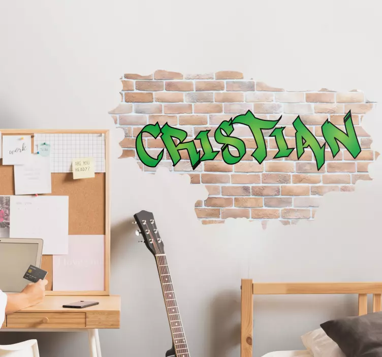 Tämä ainutlaatuinen Rikki efekti ja graffitti -nimitarra on täydellinen lisä lasten makuuhuoneen sisustukseen. Se ei vain koristele seinää, vaan luo myös vaikutelman rikkoutuneesta seinästä, jossa on tiilikuviointi ja graffitin nimi.