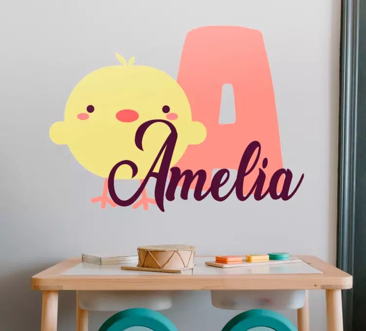Viite: A48924Söpö kana -suunnittelu esittelee ystävällisen keltaisen kanan värikkään alkukirjaimen ja muokattavan nimen rinnalla. Tämä leikkisä elementti on täydellinen luomaan ihastuttavaa tunnelmaa lapsen tilassa, lisäten lämpöä ja yksilöllisyyttä heidän huoneeseensa.