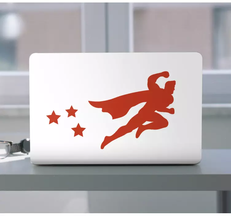 Viite: A49003Energinen kuvaus supersankarista liikkeessä, lentämässä ilmassa virtaavan viitan kanssa. Figuran mukana kulkee kolme tähteä, jotka korostavat nopeuden ja sankaruuden tunnetta. Tämä suunnittelu herättää tunteita rohkeudesta ja seikkailusta, täydellinen supersankarikulttuurin ystäville.