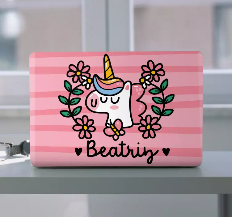 Unikornin kukkasuunnittelu läppäritarra on värikäs ja hassu lisä, joka tuo iloa kannettavaasi! Tämä vaaleanpunainen suunnittelu yhdistää yksisarvisen ja kauniit kukat raikkaissa raidoissa. Mukautettu nimi tekee siitä henkilökohtaisen ja ainutlaatuisen. Doodle-tyylinen piirustus herättää varmasti huomiota ja tuo hymyn huulille!
