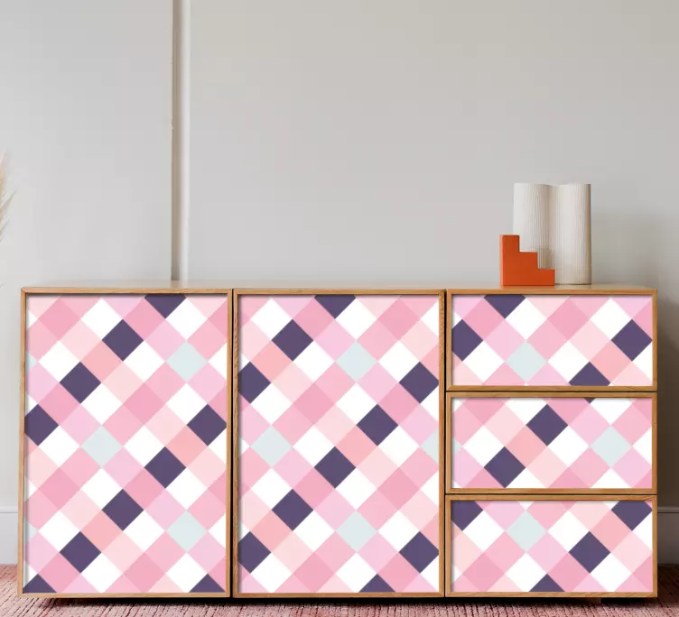 Vaaleanpunainen kuvioitu pintaesinetarra on moderni ja värikäs sisustusratkaisu, joka tuo kotiisi raikkaan ja iloisen ilmeen. Sen ruudullinen ja geometrinen suunnittelu yhdistää kauniisti kuvion ja rakenteen, tehden siitä täydellisen valinnan huonekaluille ja laatikoille. Tämä tuote on erinomainen tapa päivittää kodin sisustusta ja luoda ainutlaatuinen tunnelma!