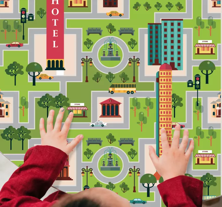 Viite: A49463Elävä kaupunkikartta, jossa on monimutkaisia yksityiskohtia, kuten rakennuksia, puita, liiketiloja ja ajoneuvoja. Se esittelee erilaisia maamerkkejä, kuten hotellin ja suihkulähteen, kannustaen lapsia mielikuvitusleikkiin ja tutkimiseen, luoden mukaansatempaavan ja interaktiivisen kokemuksen.