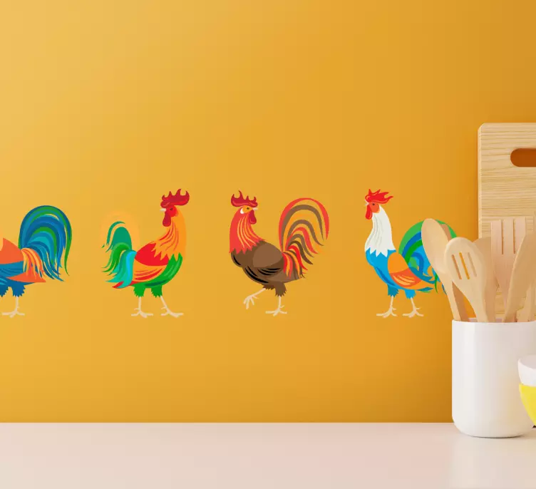 Esittelyssä Värikäs kukko koristereunus tarra, joka tuo ripauksen maatilan elämää sisustukseesi! Tämä graafisesti upea suunnittelu yhdistää elinvoimaisen kukon ja värikkäät yksityiskohdat, luoden iloisen tunnelman keittiöön tai muuhun tilaan. Kukot ja eläimet yhdistyvät tässä tarrassa, joka on täydellinen valinta kaikille maatila-teemaisille sisustajille!