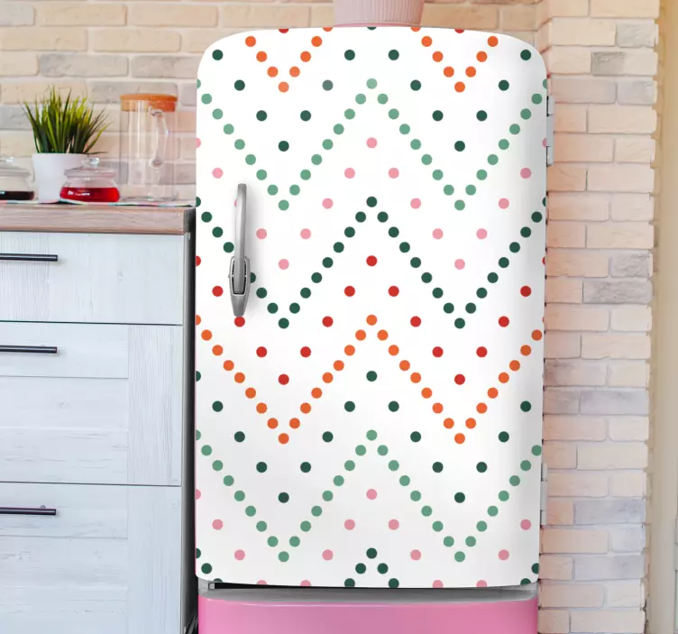 Värikäs viistoviivamalli jääkaappitarra on moderni ja värikäs lisäys keittiöön! Tämä graafinen suunnittelu on täynnä pisteitä ja siksak-kuvioita, jotka luovat iloisen ja energisen tunnelman. Terävä polkkakuvio yhdistää eri värejä tyylikkäällä tavalla, tehden jääkaapista katseenvangitsijan. Tämä tuote on täydellinen valinta, jos haluat tuoda väriä ja eloa kotiisi!