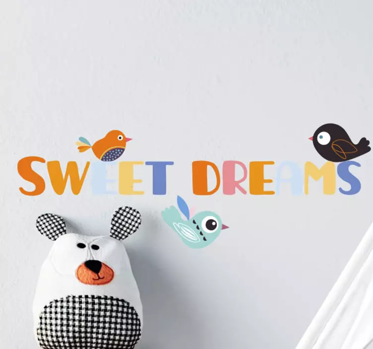 Värikäs yöilmaus sängynpääty tarra on täydellinen lisäys lastenhuoneeseen, joka tuo iloa ja leikkisyyttä sisustukseen! Suunnittelussa on mukana lintuja unelmoimassa makeista unelmista, ja moniväriset kirjaimet tuovat iloa jokaiseen hetkeen. Tämä lapsiystävällinen muotoilu on kuin pieni taideteos, joka herättää huoneen eloon ja tekee siitä paikan, jossa lapset voivat unelmoida ja leikkiä!