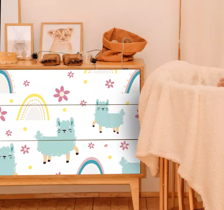 Viehättävä lama konsepti kissatarra ja koiratarra tuo sisustukseesi leikkisän ja värikkään ilmeen! Tässä graafisesti suunnitellussa tarrassa on suloisia laamoja, sateenkaaria ja kukkia, jotka yhdessä luovat hauskan ja piristävän tunnelman. Piirretty tyyli viehättää niin lapsia kuin aikuisia, ja se on täydellinen lisä huonekaluille tai muille tasaisille pinnoille, jotka kaipaavat väriä ja iloa!