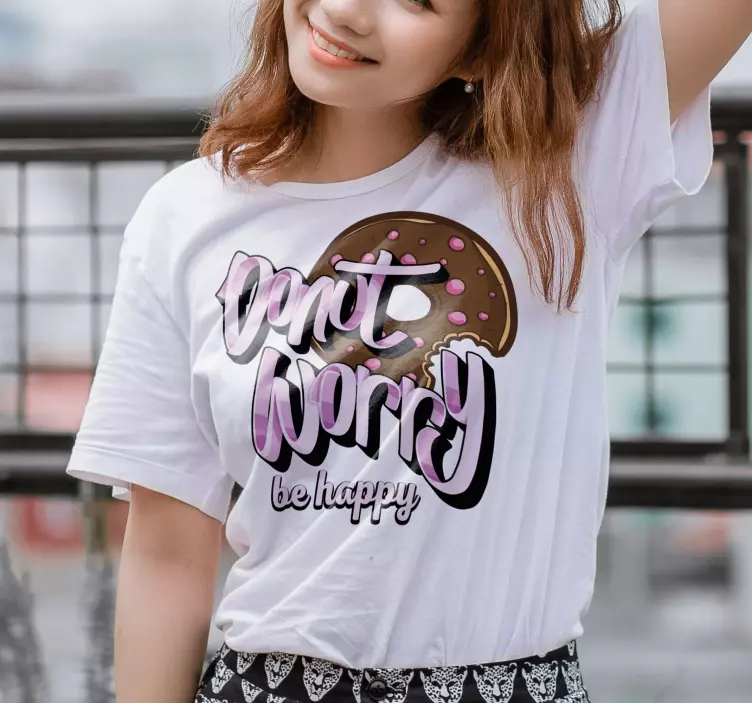 Tervetuloa iloiseen maailmaan Älä huoli ole onnellinen t-paita! Tämä graafinen suunnittelu yhdistää donitsin ja hauskan sanaleikin, joka tuo hymyn huulille. Huoli pois, sillä tämä onnellinen t-paita on täydellinen valinta juhliin tai rentoon päivään. Sen positiivinen viesti ja muoti tekevät siitä loistavan lisän vaatekaappiisi!