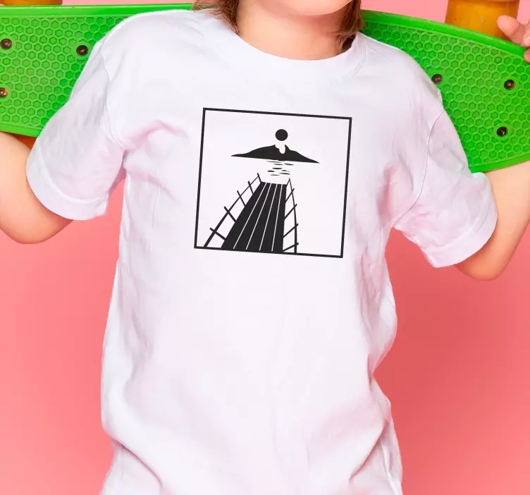 Viite: T4688Tämä suunnittelu esittää rauhallisen auringonlaskun laiturin yllä, korostaen lasta, jolla on skeittilauta. Kuvasto välittää seikkailun ja ulkona leikkimisen tunnelmaa, mikä on täydellistä lapsille. Yksinkertaiset viivat ja muodot luovat voimakkaan kontrastin, mikä tekee siitä visuaalisesti houkuttelevan nuorille.