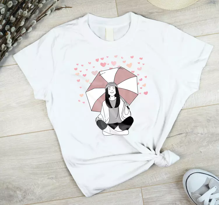 Esittelyssä Viehättävä sydänkuvio t-paita, jossa yhdistyvät söpö sarjakuvamainen design ja rento tyyli! T-paidassa on hymyilevä tyttö sateenvarjon kanssa, ympärillään sydämiä, jotka symboloivat rakkautta ja iloa. Tämä t-paita on täydellinen valinta mihin tahansa tilaisuuteen, tuoden esiin positiivisen energian ja kevyen tunnelman!
