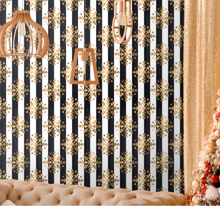 Viite: P3756Kultaisia lumihiutaleita mustavalkoisilla raidoilla tapetti olohu