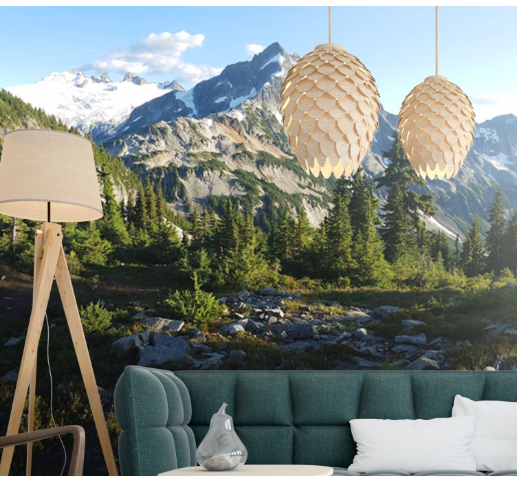 , josta näkyy kaunis vuoristomaisema. Tätä upeaa muotoilua voidaan soveltaa olohuoneeseesi, ja huomaat, että se on erittäin helppo levittää seinälle verkkosivullamme tarjoamallamme liimalla. Miksi sinun ei pitäisi ostaa tätä olohuoneentapetti kuvalla