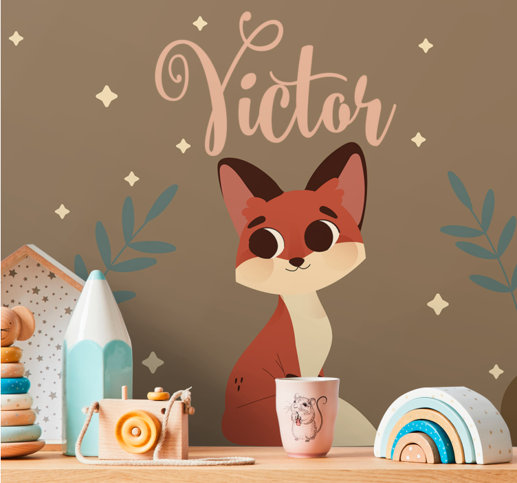 Viite: F9831Söpö kettu hahmo, jolla on ylisuuret silmät ja leikkisä luonne, ympäröitynä herkällä kasvillisuudella ja tähdillä. Suunnittelussa on mukana nimi 'Victor', joka lisää henkilökohtaisen kosketuksen tähän viehättävään motiiviin, täydellinen lasten tiloihin tai leikkisiin alueisiin.
