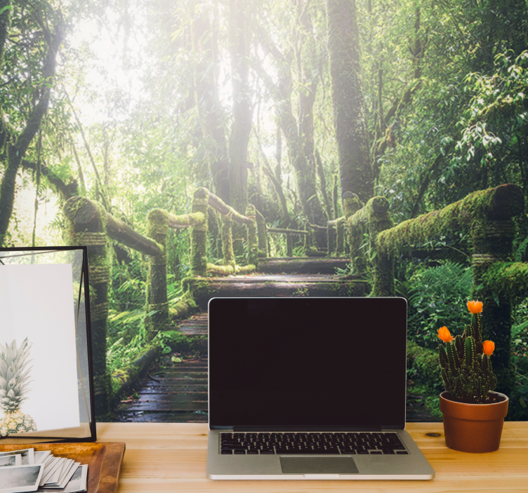 Vihreä metsäpolku luonto valokuvatapetti vie sinut rauhoittavaan luontoon, jossa polku kulkee viehättävien portaikkojen ja ikivihreiden puiden keskellä. Auringonvalo siivilöityy puiden välistä, luoden kauniin valon ja varjon leikin. Tämä graafinen suunnittelu on täydellinen yhdistelmä luontoa ja valokuvausta, jossa sammaleinen polku houkuttelee sinut seikkailulle!