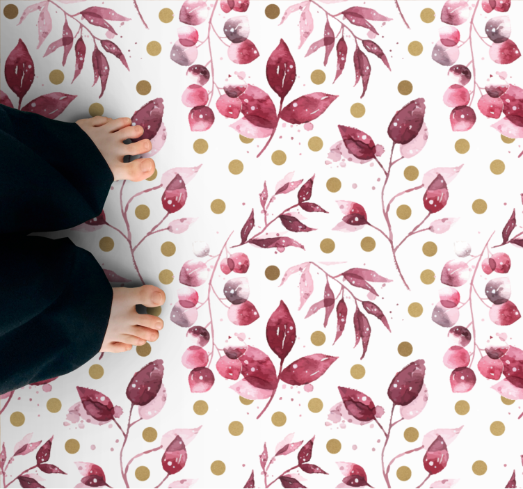 Esittelyssä Kukka vinyylimatto kasviprinttikuvioilla, joka tuo sisustukseesi ainutlaatuista viehätystä! Tämä kaunis matto on suunniteltu viininpunaisella pohjalla, ja siinä on käsinmaalattuja, vesiväri-tyylisiä kuvioita, jotka esittävät vaaleanpunaisia kukkia ja vihreitä lehtiä kultaisilla yksityiskohdilla. Sen graafinen ilme tekee siitä täydellisen lisän mihin tahansa huoneeseen!