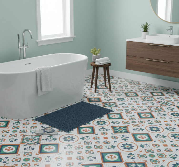 Kylpyhuoneen vinyylimatto geometriset laatat